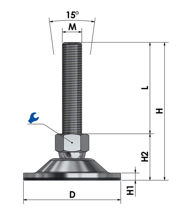 Der wartungsfreie Gelenkfuß ist stufenlos über das Gewinde höhenverstellbar (je nach Spindellänge) und bis zu einem gewissen Grad neigbar, was die präzise Montage und Ausrichtung vereinfacht.