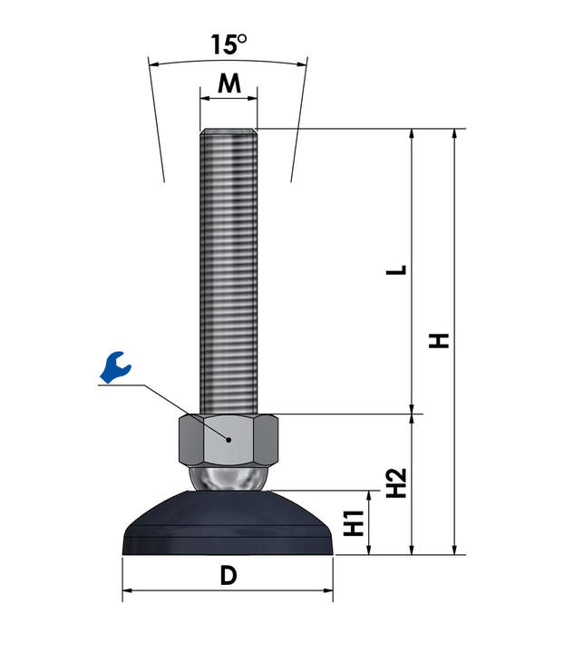 Der wartungsfreie Maschinenfuß KF60 ist stufenlos über das Gewinde höhenverstellbar (je nach Spindellänge) und bis zu einem gewissen Grad neigbar, was die präzise Montage und Ausrichtung vereinfacht.