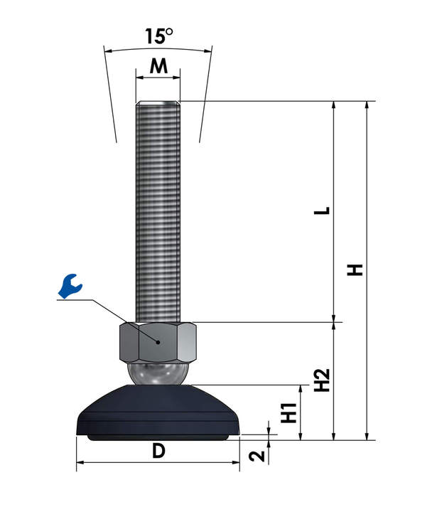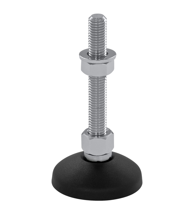 Der wartungsfreie Maschinenfuß KF60N ist stufenlos über das Gewinde höhenverstellbar (je nach Spindellänge) und bis zu einem gewissen Grad neigbar, was die präzise Montage und Ausrichtung vereinfacht.