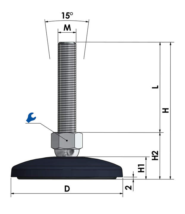 Der wartungsfreie Maschinenfuß KFE100N ist stufenlos über das Gewinde höhenverstellbar (je nach Spindellänge) und bis zu einem gewissen Grad neigbar, was die präzise Montage und Ausrichtung vereinfacht.