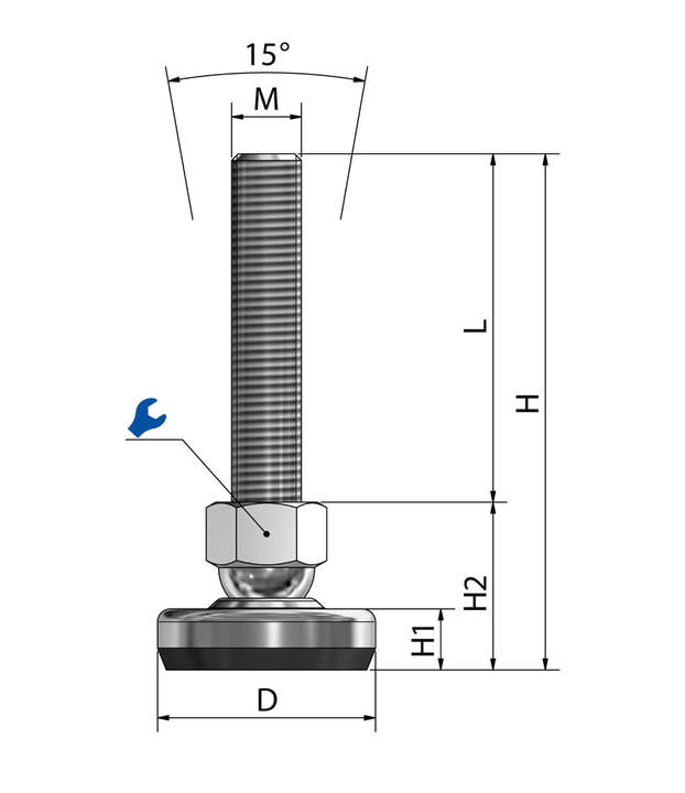 Der wartungsfreie Maschinenfuß SF50 mit 50mm Durchmesser ist stufenlos über das Gewinde höhenverstellbar (je nach Spindellänge) und bis zu einem gewissen Grad neigbar, was die präzise Montage und Ausrichtung vereinfacht.