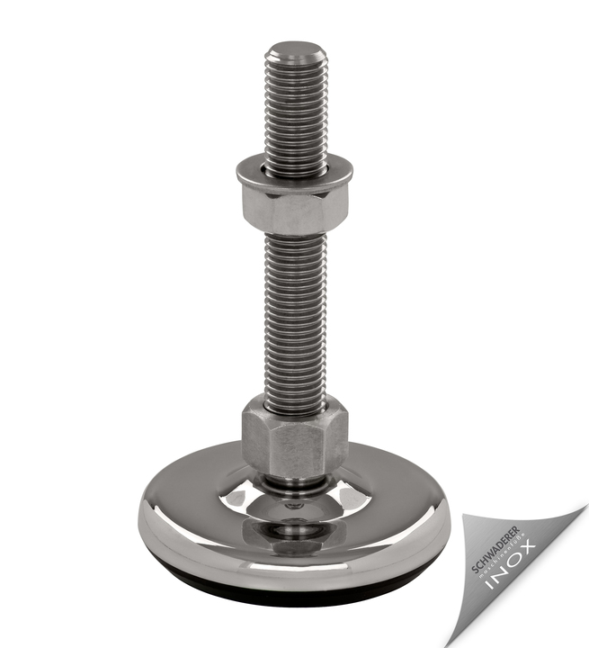 Der wartungsfreie Stellfuß SFE100 ist stufenlos über das Gewinde höhenverstellbar (je nach Spindellänge) und bis zu einem gewissen Grad neigbar, was die präzise Montage und Ausrichtung vereinfacht.