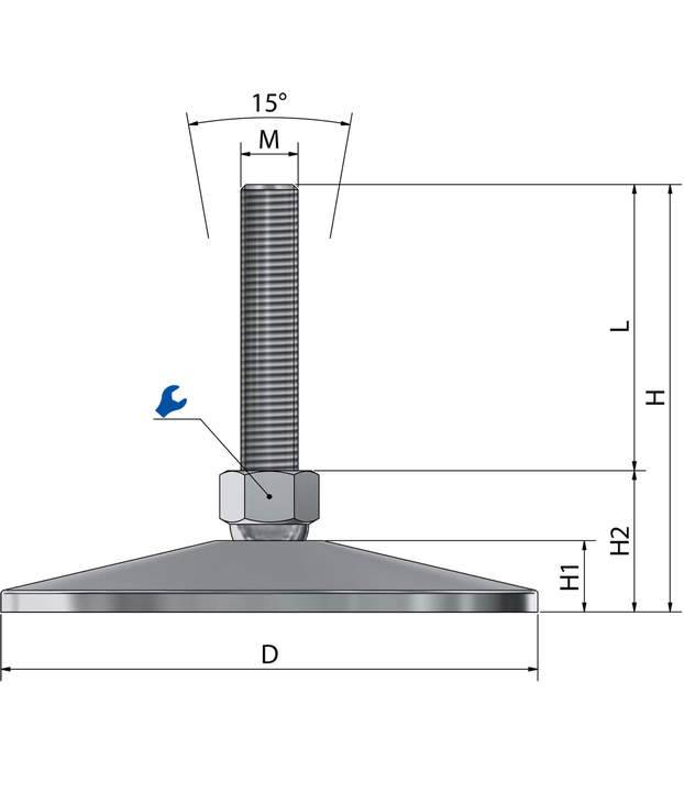 Der wartungsfreie Maschinenfuß bzw. Stellfuß VME150 ist stufenlos über das Gewinde höhenverstellbar (je nach Spindellänge) und bis zu einem gewissen Grad neigbar, was die präzise Montage und Ausrichtung vereinfacht.