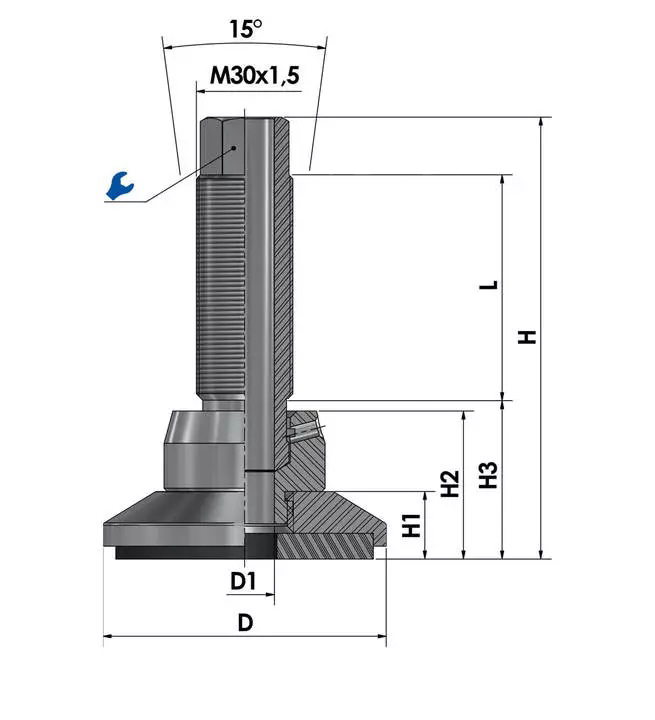 Der wartungsfreie Nivellierfuß JCMHD 80C-S6-HSD180 ist stufenlos über das Feingewinde höhenverstellbar und bis zu einem gewissen Grad neigbar, was die präzise Montage und Ausrichtung vereinfacht.