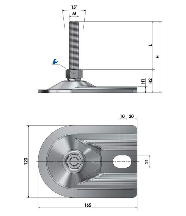 Der wartungsfreie Stellfuß bzw. Maschinenfuß ist stufenlos über das Gewinde höhenverstellbar (je nach Spindellänge) und bis zu einem gewissen Grad neigbar, was die präzise Montage und Ausrichtung vereinfacht.