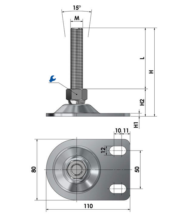 Der wartungsfreie Stellfuß bzw. Maschinenfuß ist stufenlos über das Gewinde höhenverstellbar (je nach Spindellänge) und bis zu einem gewissen Grad neigbar, was die präzise Montage und Ausrichtung vereinfacht.