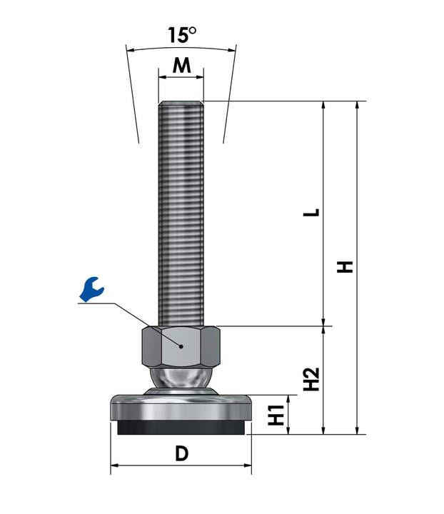 Der wartungsfreie Stellfuß SF50ESD ist stufenlos über das Gewinde höhenverstellbar (je nach Spindellänge) und bis zu einem gewissen Grad neigbar, was die präzise Montage und Ausrichtung vereinfacht.